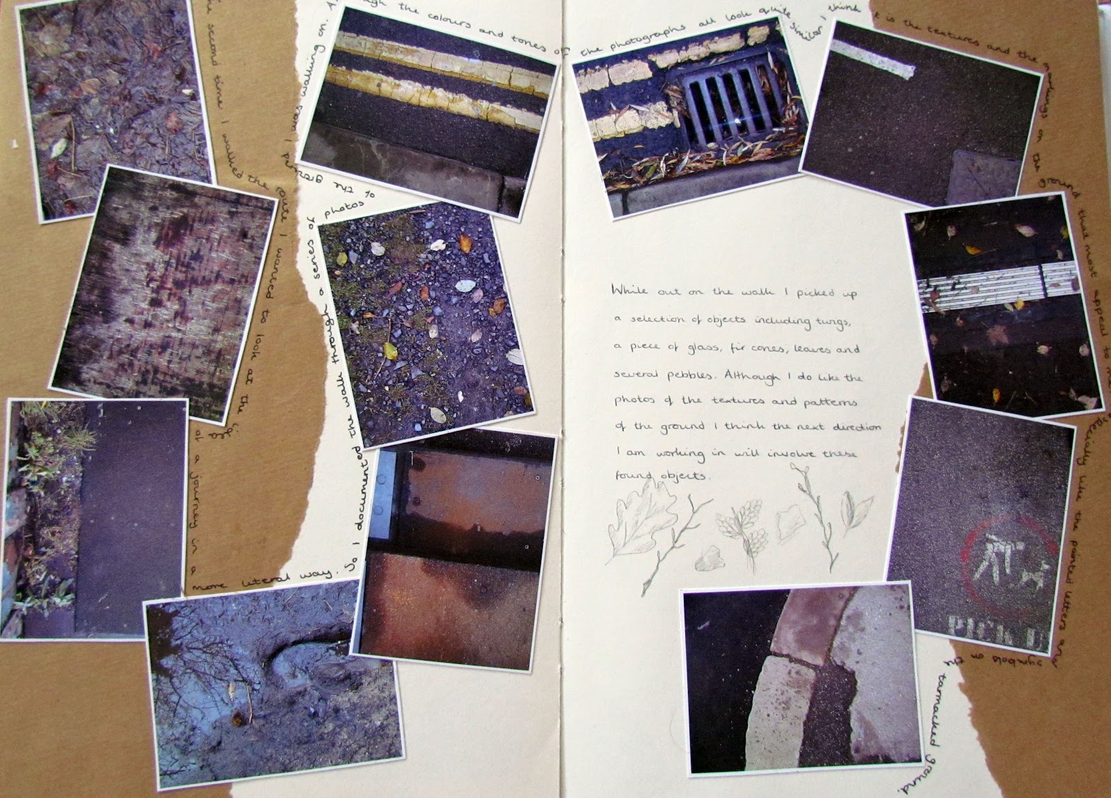 So, after the disaster that was the first walk, I decided I needed to go back and take some pictures that I could actually work with. Since I spent most of my time on the first walk looking at the ground I concentrated on the texture and patterns of the paths we walked on and the contrast between the more rural areas of the route and the more urban areas. I took a photo every so often along the route and arranged them in the order they were taken.